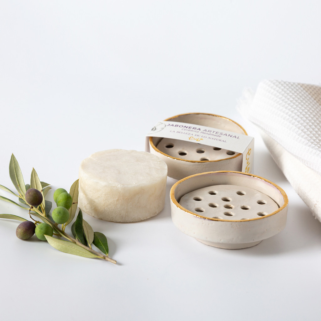 Jabonera de cerámica esmaltada en blanco roto con filo dorado. Es una pieza hecha a mano. Todas son diferentes, únicas y especiales.